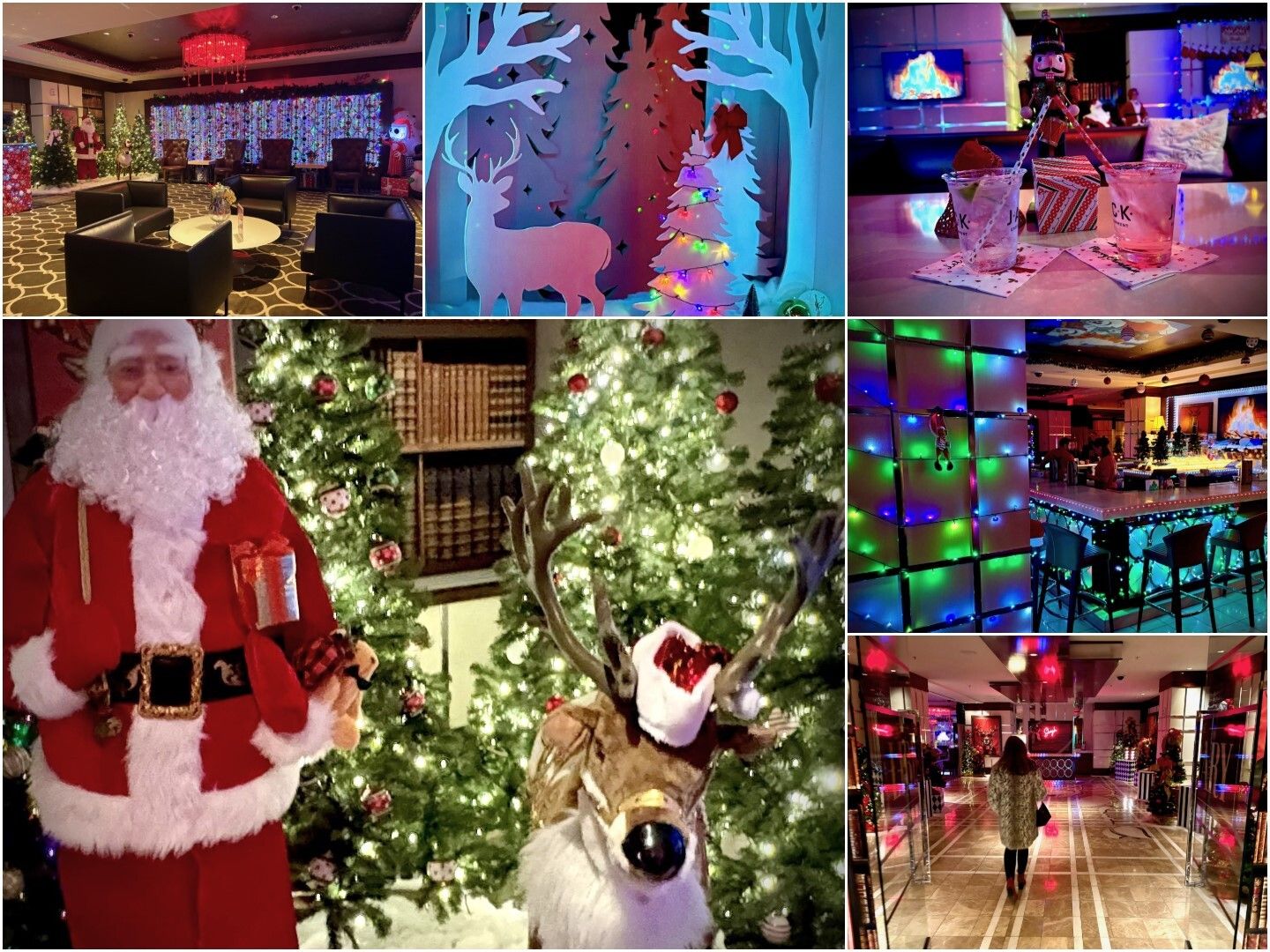 The lounge glows with chandeliers, light and ornaments; sparkling silver Christmas trees; an animatronic Santa and Rudolph display; immaculate gift boxes and holiday nostalgia.