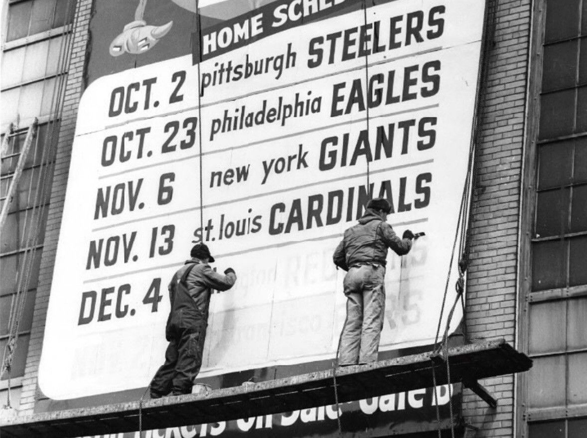 Cleveland Municipal Stadium, 1960. Painters cover over the Browns schedule to prepare for the upcoming Indians season.