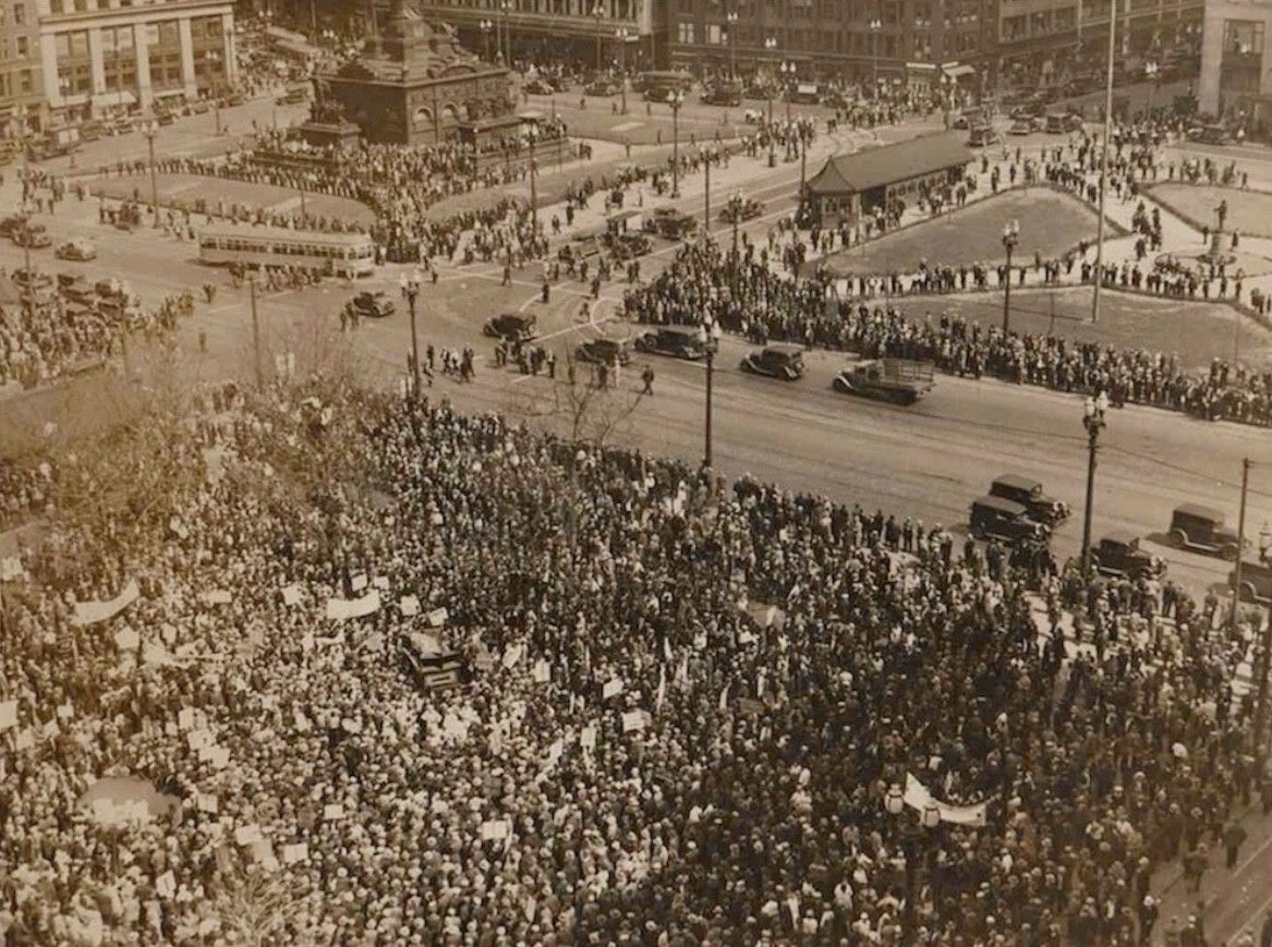Thousands of workers protest unemployment and economic hardship on May Day, 1933, in Public Square.