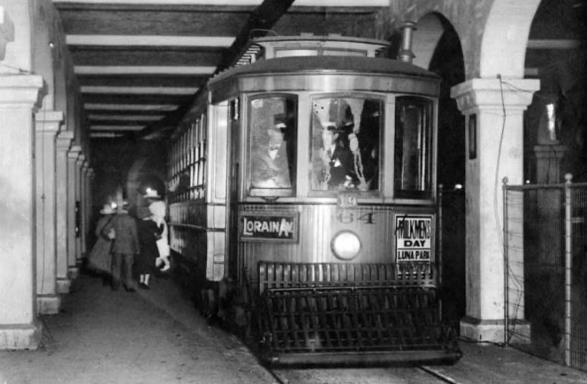 People board a train under the Veterans Memorial Bridge, 1918. From its opening that year until 1954, the lower-level hosted Cleveland’s first, and only subway, connecting transit lines on the west side with downtown.