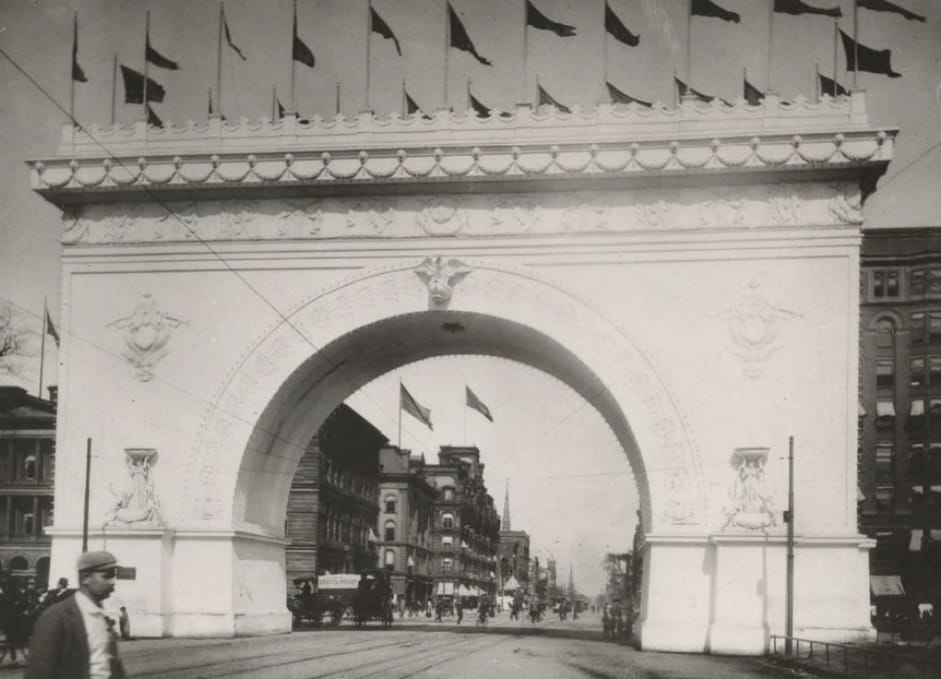 The Cleveland Centennial Arch on Superior Avenue in Public Square, 1890s.